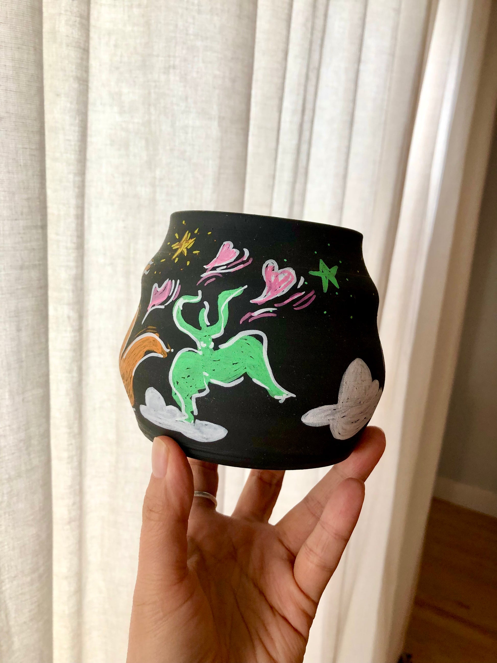 This beautifully crafted black vase from Moon Pottery is more than just a piece of art – it’s a celebration of joy and movement. Hand-painted with dancing figures and intricate pen-drawn art, it carries a happy vibe that brings life and warmth to any space. Give it as a gift to someone who loves unique, handmade treasures, and let this vase be a symbol of happiness and creativity.