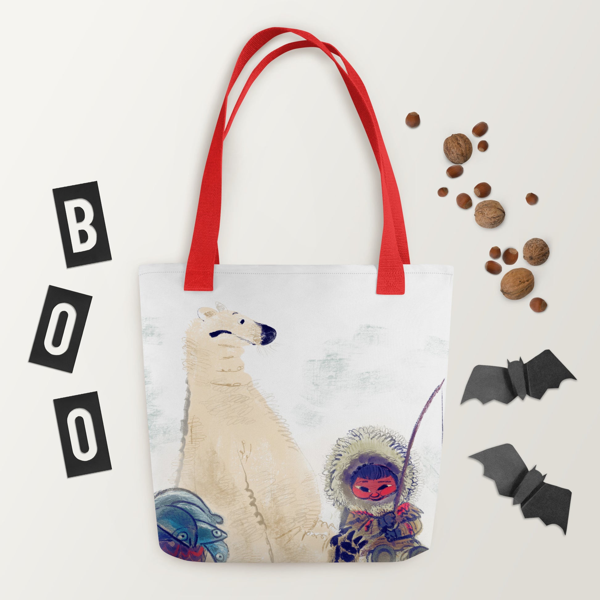 "Polar Bear and Eskimo Boy Fishing Tote Bag - Hand-Drawn by Leo Matsuda | Unique Art Tote"