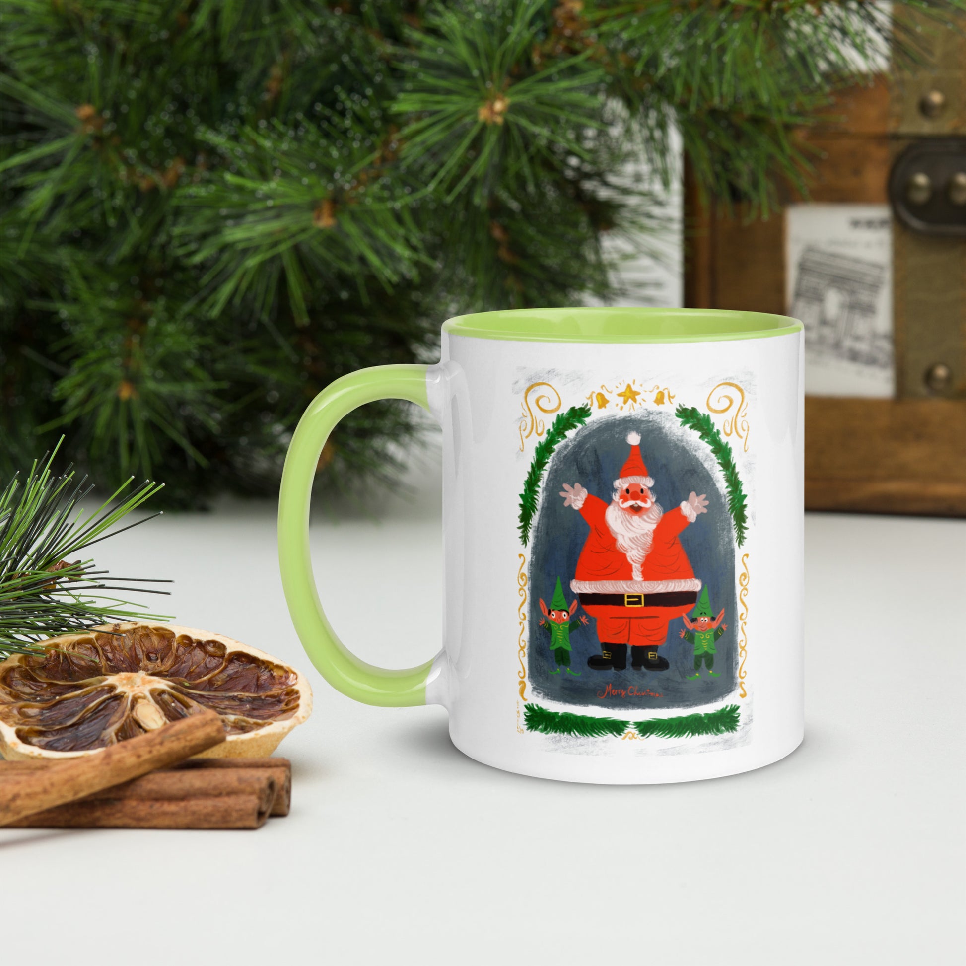 "Santa and Elves Mug with Color Inside - Hand-Drawn by Leo Matsuda | Festive Christmas Mug"
